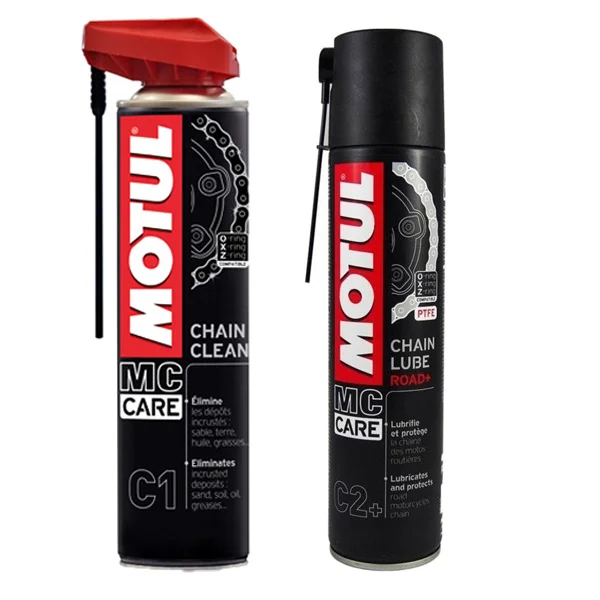 PROMO Spray Curățat Lanț C1 + Spray Lubrifiant Lanț – MOTUL C2+ 400ml